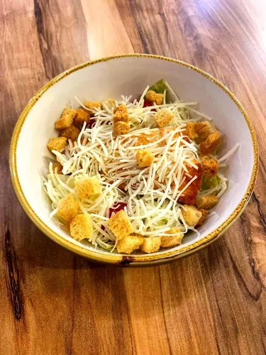 Креветки, салат айсберг, томаты черри, сыр пармезан, соус цезарь.