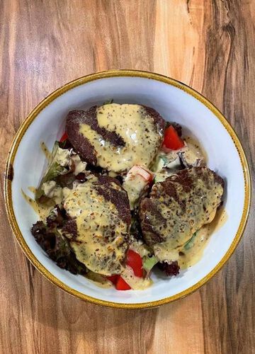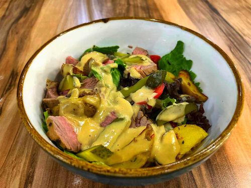 Вырезка говяжья, салат микс, томаты розовые, огурец, масло зеленое, соус гамадари.
