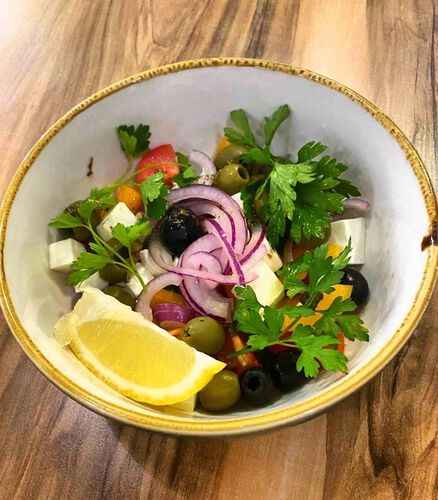 Огурец,помидоры, перец болгарский, лук красный, оливки, сыр фетакса, масло, лимоны, маслины.