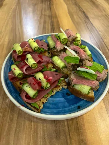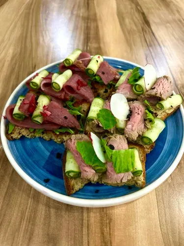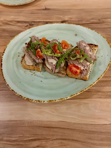 Брускетта с ростбифом 3 шт: хлеб 3 кусочка, ростбиф, томаты вяленые, соус ветелло-томато, руккола, маслины. (фото для примера)