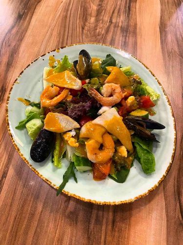 Огурец, томаты розовые, креветки, мидии, кальмар, бобы соевые, сыр креметта, соус том-ям