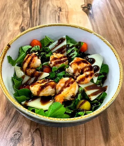 Руккола, тигровые креветки, томаты черри, сыр пармезан, соль, орехи кедровые, масло оливковое, соус-крем бальзамический.