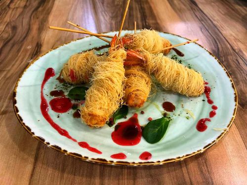 Креветки, катаифи тесто, ягодный соус, терияки, соль, перец, маслины, масло зеленое.