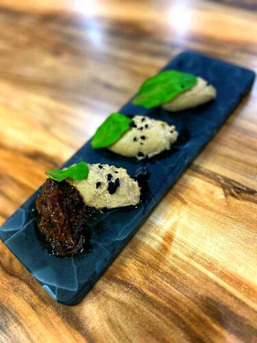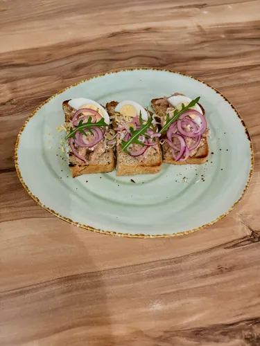 Брускетта с печенью трески 3 шт: хлеб 3 кусочка, айоми, печень трески, перепелиные яйца, лук маринованный крсный, горох кресс, оливковое масло. (фото для примера)