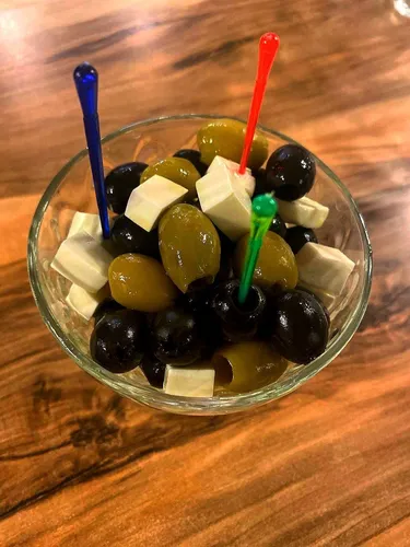 Камамбер, сухари панировочные, яйцо, мука, соль, зеленое масло, ягодный соус, маслины.