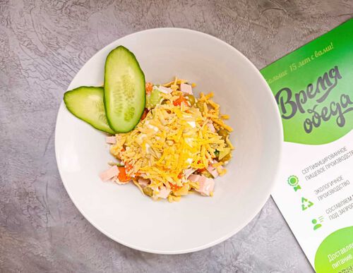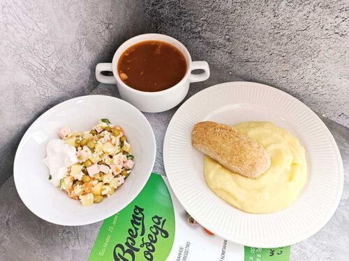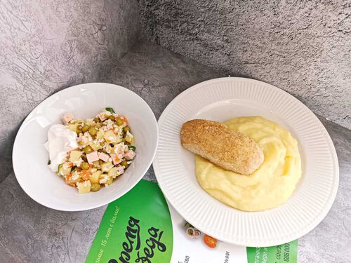 Салат Оливье (120 гр.), сосиски отварные (120 гр.) с картофельным пюре (200 гр.).