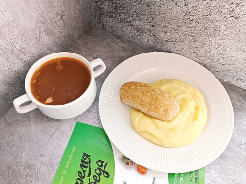 Суп картофельный с курицей (300 мл.), сосиски отварные (120 гр.) с картофельным пюре (200 гр.).