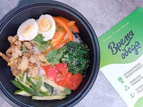 Состав: курица жар., рис, огурец свежий, яйцо, перец болгарский, кинза, чука, соус терияки, соус арахисовый