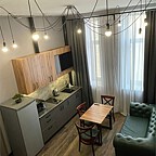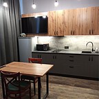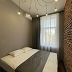 Каждый номер оснащен двуспальной кроватью, кухней, smart TV, кондиционером, Wi-Fi, ванной комнатой, шторами black-out, постельным бельем и полотенцами, тапочками и средствами гигиены.