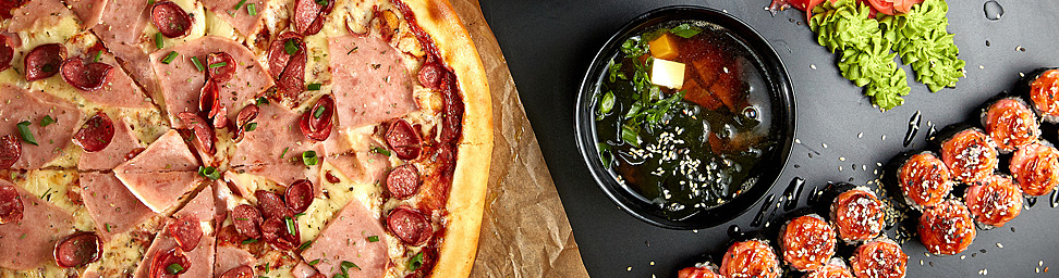 Наше меню - это настоящий праздник для гурманов. Пышная, ароматная пицца с разнообразными начинками, сочные, тающие во рту бургеры, приготовленные из отборного мяса, и изысканные роллы, сочетающие в себе свежесть ингредиентов и тонкий вкус - каждый найдет свое идеальное блюдо.