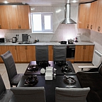 Полностью оборудованную кухню со всеми удобствами (холодильник, плита с вытяжкой, микроволновка, чайник, посуда, столовые приборы);