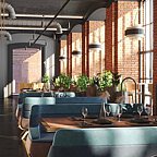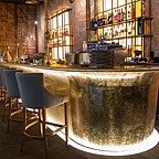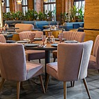 Интерьер ресторана выполнен в современном дизайне: кирпичные стены, массивная барная стойка, большие панорамные окна, много света и свежей зелени. Арт-объекты и элементы интерьера отсылают к истории, культуре и географии страны. Так, волнистый орнамент колонн в главном зале ресторана, напоминает о теплых волнах Каспийского моря, на берегу которого расположен город Баку.