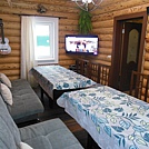 В вашем распоряжении бревенчатый дом 2 этажа. На первом этаже гостиная с телевизором, караоке, гитарой. Уютная кухня с холодильником, варочной панелью, микроволновой печью, посудой; ванная комната. На втором этаже расположены 3 спальные комнаты на 11 спальных мест.