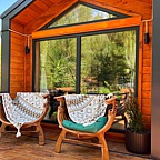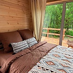 Дом 24 квадратных метра с террасой, имеет большие панорамные окна, и Вы можете просыпаться с видом на озеро и лес.
