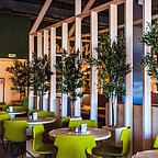 "Green Villa Pizza" – современное динамичное кафе. Трендовый эко-дизайн заведения, выполненный в сочных цветах с использованием европоддонов, был растиражирован во многих мировых изданиях по дизайну интерьеров.