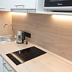Во всех номерах есть полноценные кухонные зоны с наличием всей необходимой бытовой техники и приборов, спальные места, оборудованные современными ортопедическими матрасами с независимыми пружинными механизмами и высококачественным постельным бельем, полный набор бытовой техники.