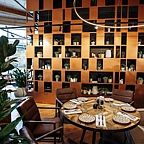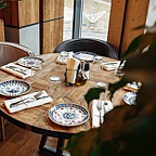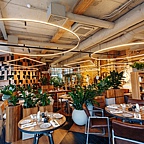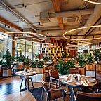 В интерьере разнообразные живые растения, удобная деревянная мебель, панорамные окна, красивый вид на парк, уютные диванчики с яркими подушками — всё это создаёт атмосферу уюта и комфорта.