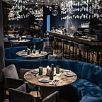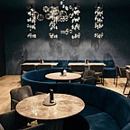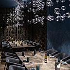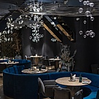 Интерьер ресторана погружает в глубину моря, позволяя ощутить его силу и мощь. Посмотрев наверх, можно наблюдать за косяком рыб, плывущих по всей площади ресторана, а массивные черные колонны имитируют известный черный песок Халактырского пляжа.