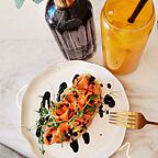 У нас Вы можете пробовать авторские роллы, сырники со свежими ягодами, салат с лососем и сырным кремом, пасту с тигровыми креветками, поке с куриным филе. В дополнение предложим торты, меренговые рулеты и зефир.