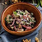 На закуску в "MamaLыga Bar" — любимая кавказская еда от гуру грузинской кухни. Приносят быстро, стоит недорого: салат с томатами, терпким овечьим сыром и жареным хрустящим джонджоли; печеный перец с надуги и соусом гебжалия; нарядный аджапсандал; хашлама с бараниной; сочный шашлык из свинины, едва подкопченный на яблочной стружке, и хачапури-лодочка по-аджарски, лишающее вас воли.