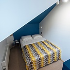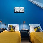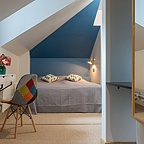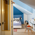Здесь скошенные потолки, необычная геометрия и стильный интерьер, с цитатами из 60х годов.