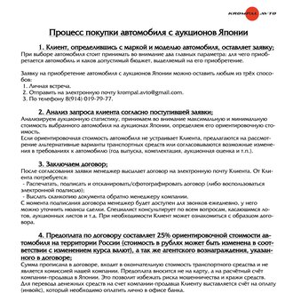 Каждый покупатель гарантированно получает именно ту машину и в том виде, состоянии и комплектации, в котором она была выставлена на аукционных торгах. Мы предлагаем Вам профессиональные, деловые отношения, построенные на взаимном доверии и абсолютной открытости.