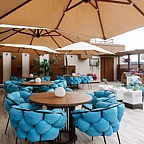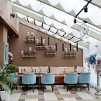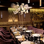 В контраст шумному залу гостей удивит "Зимний сад" — место, где можно уединиться, полюбоваться орхидеями и экзотическими растениями. Этот зал идеален для проведения выездных регистраций, мастер-классов и всевозможных интерактивов. Стеклянная крыша создает много естественного света, увеличивая пространство зала. Используя архитектурные приемы и современные акустические материалы, нам удалось добиться великолепной акустики во всех помещениях. Стоит отметить, что диваны, обеденные столы, барная стойка, светильники, элементы декора выполнены по индивидуальным эскизам. Скульптуры и барельеф, так же являются авторскими.