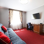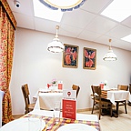 Интерьеры общественных зон приглашают нас в Россию. Мебель орехового цвета, авторские предметы интерьера и ручная роспись потолков создает особый шарм, позволяя насладиться национальным колоритом России.