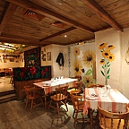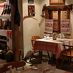 Атмосфера настоящей украинской мазанки, с белыми стенами, подсолнухами и настоящей глиняной печью с горшками и ухватами, скатертями и рушниками с украинским орнаментом и ковром ручной работы.