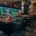 Интерьер ресторана оформлен с азиатскими мотивами: стены с традиционными веерами, иероглифами, картинами и масками.