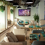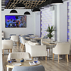 Заведение оформлено в стиле европейского кафе и разделено на 2 зала: основной белый и спокойный лаунж бар.