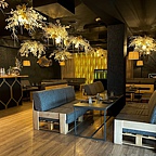 В светлый и лаконичный интерьер гармонично вписаны уникальные стеклянные аквариумы, в которых обитают камчатские крабы, морские ежи, гребешки и устрицы.