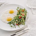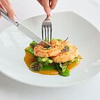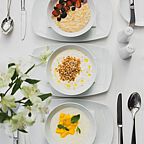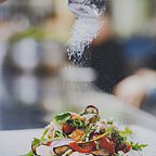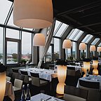 Концепция кухни – европейская и русская классика: это гармоничное сочетание последних тенденций и национальных традиций, актуальных поварских техник и самых неожиданных рецептов, переосмысленных в реалиях современности. Дизайн разработал известный японский архитектор Шигео Накамура (Токио) . В дизайне использовался натуральный камень, дерево и стекло. Все столы расположены вдоль огромных панорамных окон. Вечером большие абажуры и светящиеся тумбы-вазы создают особое романтическое настроение: под звуки рояля на столах зажигают свечи.