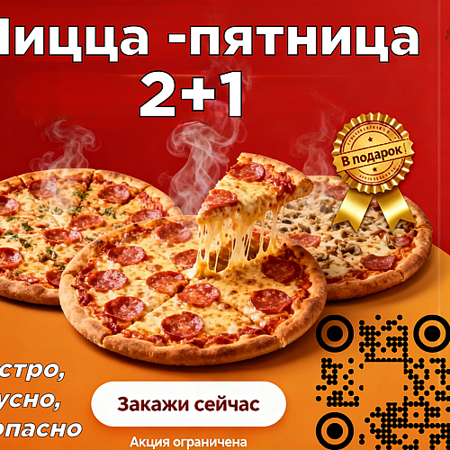 Еженедельная акция «Пицца 2+1»: закажите 2 любые пиццы — третью получите в подарок!