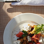При приготовлении блюд используется продукция местных производителей, а также овощи и фрукты, выращенные на собственных угодьях.